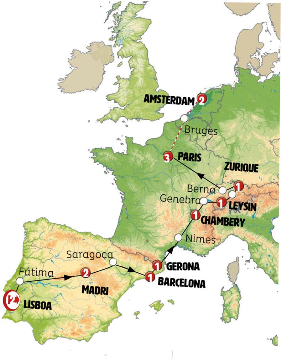 Lisboa, Cáceres, Madrid, Zaragoza, Poblet, Barcelona, Gerona, carrieres de lumiere, Chambery, Genebra, Gruyeres, Leysin, Interlaken, Lucerna, Zurich, Strasbourg, Paris, Bruges, Amsterdã.