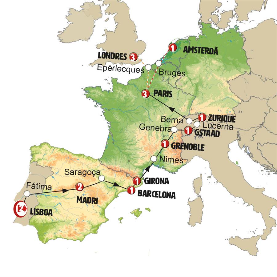 A etapa de hoje oferece belíssimas paisagens de alta montanha.. Não esqueça suas roupas de inverno, tomaremos o teleférico até um dos pontos mais espetaculares da Suíça, onde podera ver gelo e neve o ano inteiro. Incluímos o passeio de teleférico até o GLACIER 3000, onde você pode caminhar na ponte suspensa sobre o vão entre dois picos de montanha, entrar na Catedral do Gelo ou "brincar" no Parque de Diversões. Parada em INTERLAKEN na hora do almoço. Entre lagos muito pitorescos continuamos para LUCERNE, uma das mais belas cidades da Suíça. Continue até ZURIQUE, tempo para passear no centro antes de ir para o hotel.Nota: Em caso de condições meteorológicas adversas ou outros imprevistos, o teleférico para o Glacier 3000 poderá estar fechado. Nesse caso, ofereceremos uma alternativa igualmente espetacular para apreciar as paisagens alpinas.