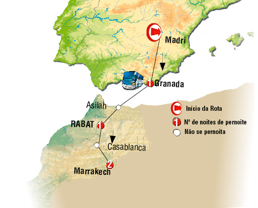 Saída de Granada, atravessando a Costa do Sol. Em Algeciras ou no porto de Tarifa embarque em um moderno ferry, para cruzar o estreito de Gibraltar (ticket incluído). Normalmente o ônibus não será embarcado, sendo assim, cada passageiro deverá levar e se responsabilizar por suas bagagens no ferry. Chegada ao Marrocos. Entre belas paisagens, continuação até ASILAH. Pitoresca e pequena cidade amuralhada situada em frente ao Oceano Atlântico, que foi um antigo porto de piratas. Hoje, a população tem muita vida. Tempo para almoçar. A viagem continua até RABAT. Chegada. Jantar incluído.