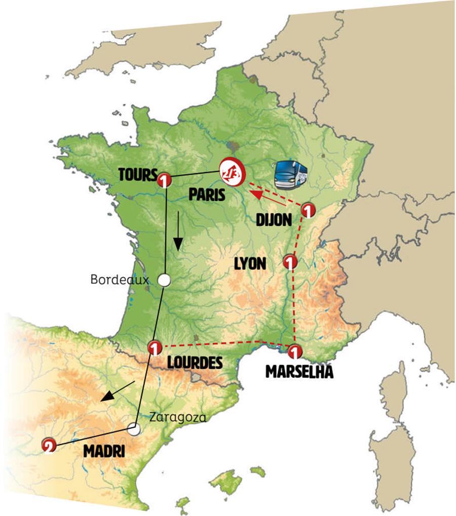Paris, Tours, Bordeaux, Lourdes, Sallent de Gallego, Zaragoza, Madrid.