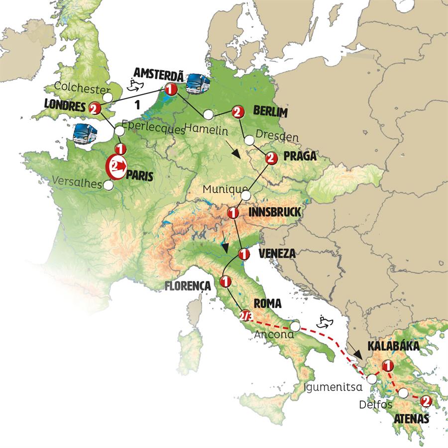 Paris, Rouen, canal de la mancha, Canterbury, Londres, colchester, ferri colchester volendam, Volendam, Amsterdã, Hamelin, Berlim, Dresden, Praga, Munique, Innsbruck, Veneza, Florença, Siena, Assis, Roma.