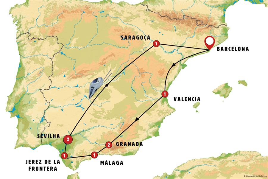 Barcelona, peniscola, Valência, Alicante, Guadix, Granada, Nerja, Frigiliana, Málaga, Puerto Banus, setenil de las bodegas, Ronda, Jerez de La Frontera, el puerto de santa maria, Cádis, Sevilha, palos de la frontera, Huelva, El Rocio, Zaragoza, Poblet.
