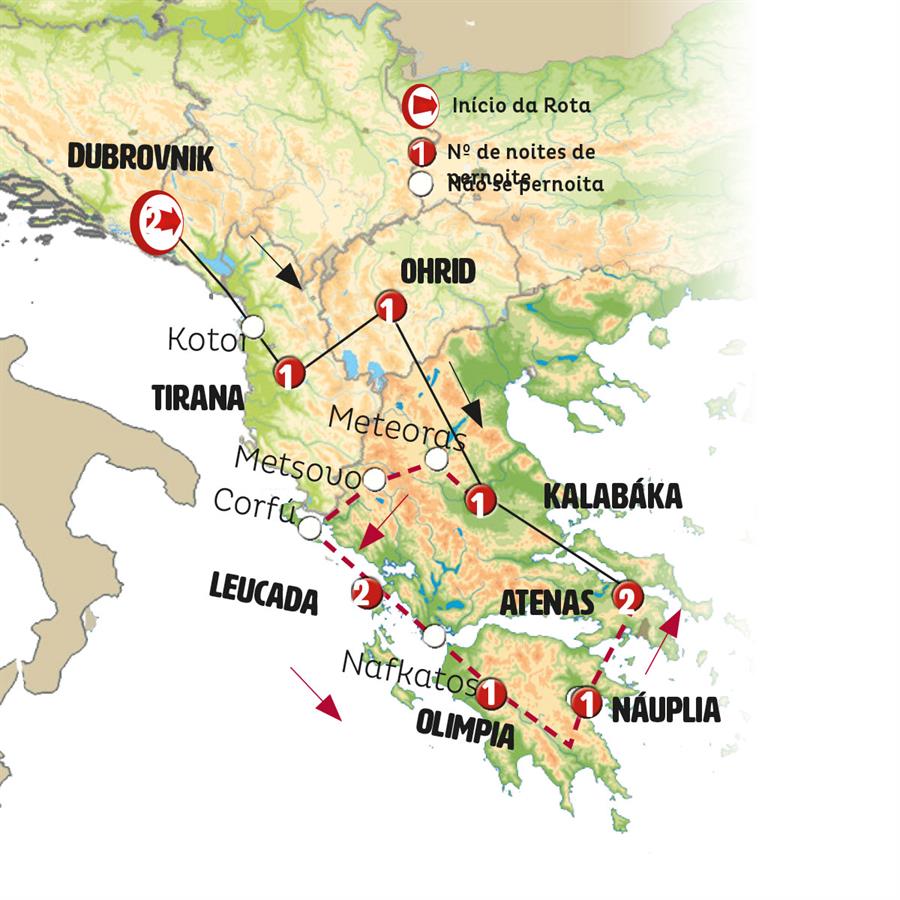 Dubrovnik, Kotor, Budva, Tirana, struga, Ohrid, Bitola, Kalambaka, Delfos, Atenas.