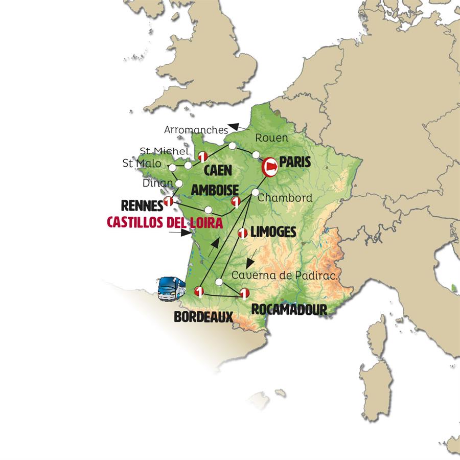 Paris, Rouen, Arromanches, Caen, Mont Saint Michel, saint malo, Dinan, Rennes, Angers, Tours, Villandry, Amboise, Chenonceaux, Chambord, Limoges, Sarlat, beynac et cazenac, Rocamadour, Caverna de Padirac, collonges la rouge, Saint Emilion, Bordeaux.