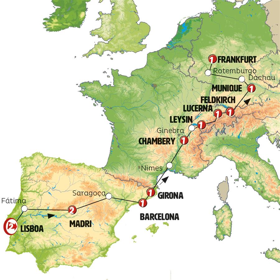 Lisboa, Cáceres, Madrid, Zaragoza, Poblet, Barcelona, Gerona, carrieres de lumiere, Chambery, Genebra, Gruyeres, Leysin, Interlaken, Lucerna, Einsiedeln, Vaduz, Feldkirch, Lago Constança , Lindau, Munique, Füssen, Rotemburgo, Frankfurt.