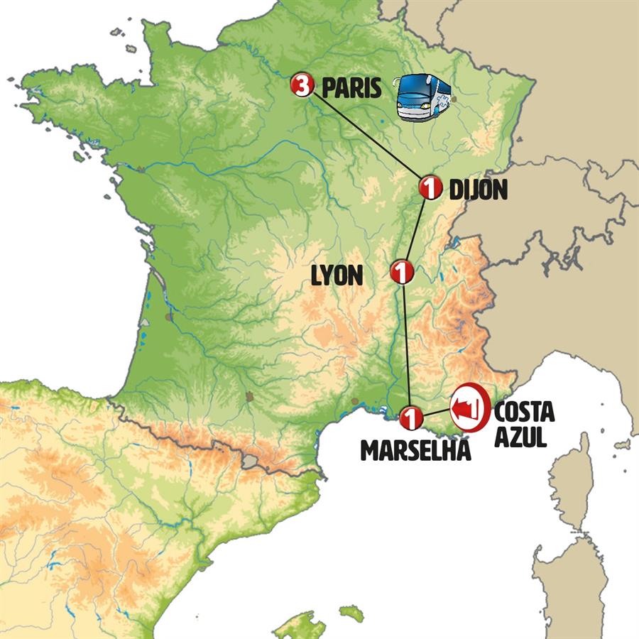 Cote D´azur, santa maxima, Saint Tropez, Marselha, Arles, Avignon, Lyon, Tournus, castillo de savigny, Beaune, Dijon, abadia de fontenay, semur en auxois, vezelay, Paris.