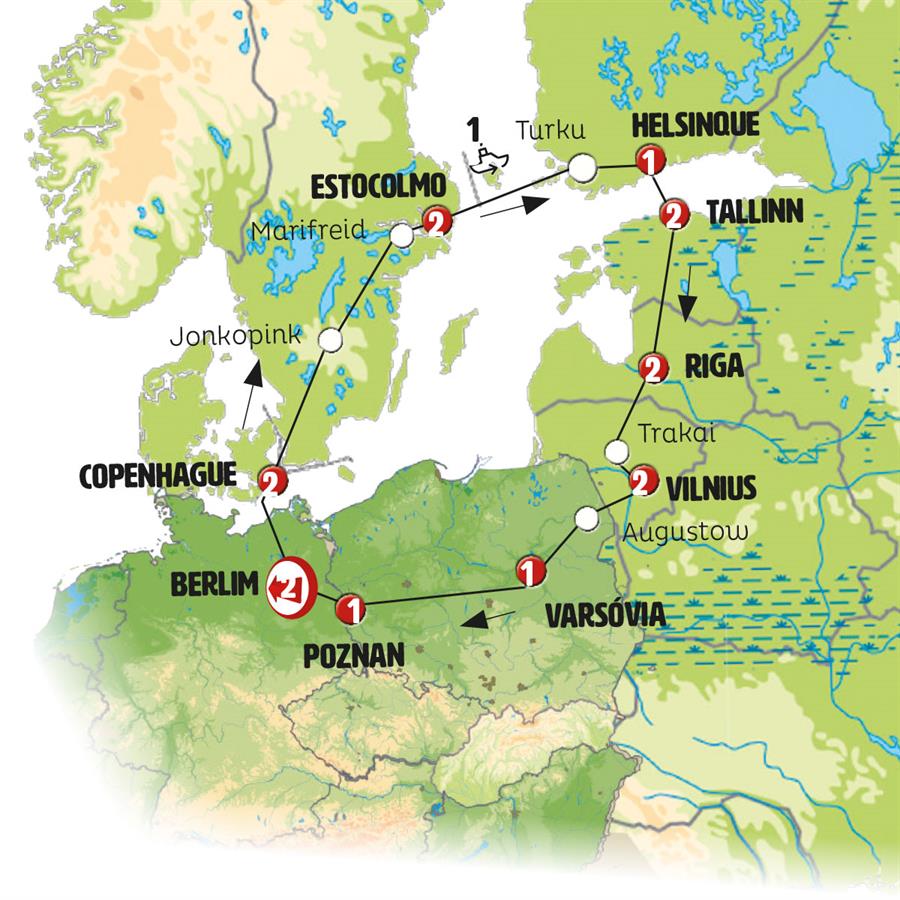 Berlim, Copenhague, jonkoping, vadstena, Estocolmo, ferri estocolmo turku, Naantali, Helsinki, ferri helsinki tallin, Tallin, Parnu, Turaida, Sigulda, salaspils, Riga, Rundale, Vilnius, Grutas Park, Augustow, Varsóvia, Poznan.