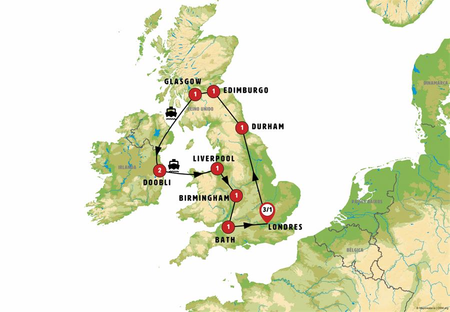 Londres, Cambridge, York, Durham, Alnwick, Edimburgo, Inverness, Lago Ness, Fort Augustus, Glasgow, belfast, Dublin, Caernarfon, Liverpool, Chester, lichfield, Birmingham, stratford, stow on the wold, gloucester, Bath, stonehenge, Salisbury.