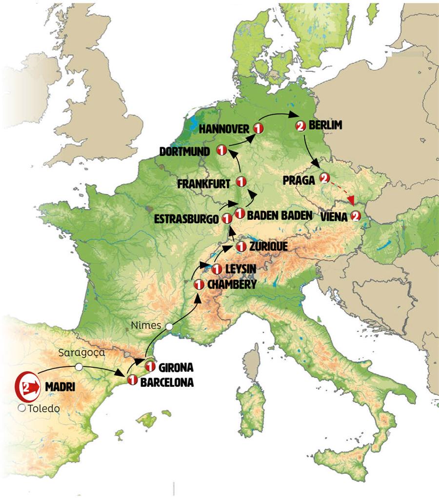 Madrid, Zaragoza, Poblet, Barcelona, Gerona, carrieres de lumiere, Chambery, Genebra, Gruyeres, Leysin, Interlaken, Lucerna, Zurich, basilea, Colmar, Riquewihr, Strasbourg, friburgo de brisgovia, Triberg, Gengenbach, baden baden, espira, Heidelberg, Frankfurt, crucero por el rhin, Colônia, Dortmund, ruta cuentos de hadas, Hannover, Goslar, Berlim, Dresden, Praga.