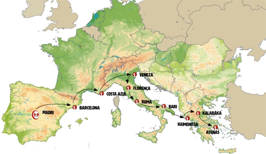 Madrid, Zaragoza, Barcelona, Cote D´azur, Cidade de Mônaco, Gênova, Veneza, Florença, Roma, abadia san giovanni in venere, Termoli, Bari, Brindisi, ferri brindisi igumenitsa, Igumenitsa, Metsovo, Kalambaka, Delfos, Hosios Loukas, Atenas.