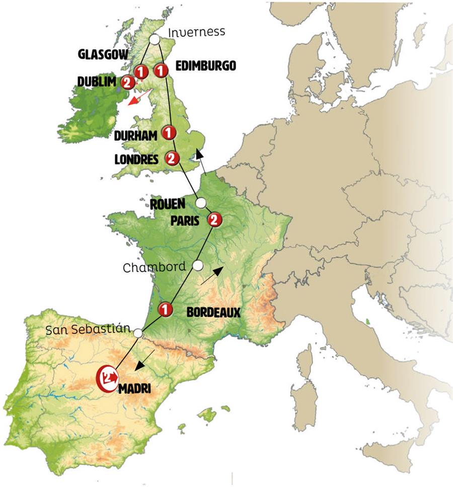Madrid, San Sebastian, Bordeaux, Chambord, Paris, Rouen, canal de la mancha, Canterbury, Londres, Cambridge, York, Durham, Alnwick, Edimburgo, Inverness, Lago Ness, Fort Augustus, Glasgow, belfast, Dublin.