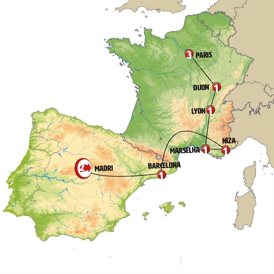 Madrid, Zaragoza, Barcelona, Cote D´azur, santa maxima, Saint Tropez, Marselha, Arles, Avignon, Lyon, Tournus, castillo de savigny, Beaune, Dijon, abadia de fontenay, semur en auxois, vezelay, Paris.