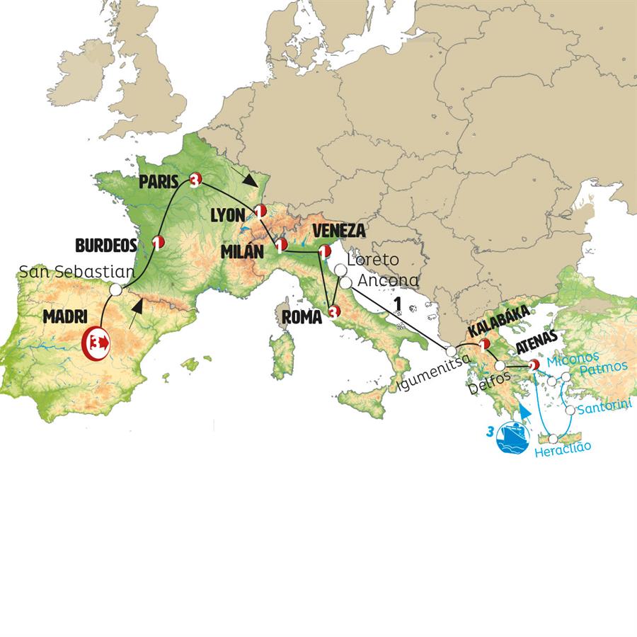 Madrid, San Sebastian, Bordeaux, Chambord, Paris, borgoña, Beaune, Lyon, Genebra, Milão, Veneza, Ravena, Assis, Roma, Atenas, Kamena Vourla, Kalambaka, Delfos, miconos, Kusadasi, Patmos, Heraclion, Santorini.