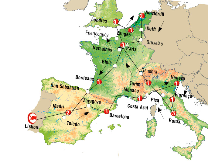 Madrid, Zaragoza, Barcelona, Cote D´azur, Cidade de Mônaco, Gênova, Veneza, Florença, Roma, Pisa, Torino , Genebra, Paris, Canterbury, Londres, canal de la mancha, Bruges, Gante, Middelburg, Roterdã, Amsterdã, kinderdijk, Bruxelas, Blois, Tours, Bordeaux, San Sebastian, Area de Serviço Foronda.