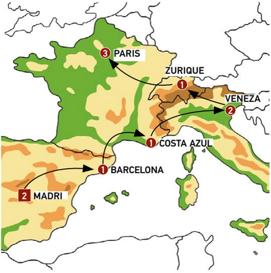 Madrid, Zaragoza, Barcelona, Cote D´azur, Cidade de Mônaco, Gênova, Veneza, Lugano, Lucerna, Zurich, Strasbourg, Paris.