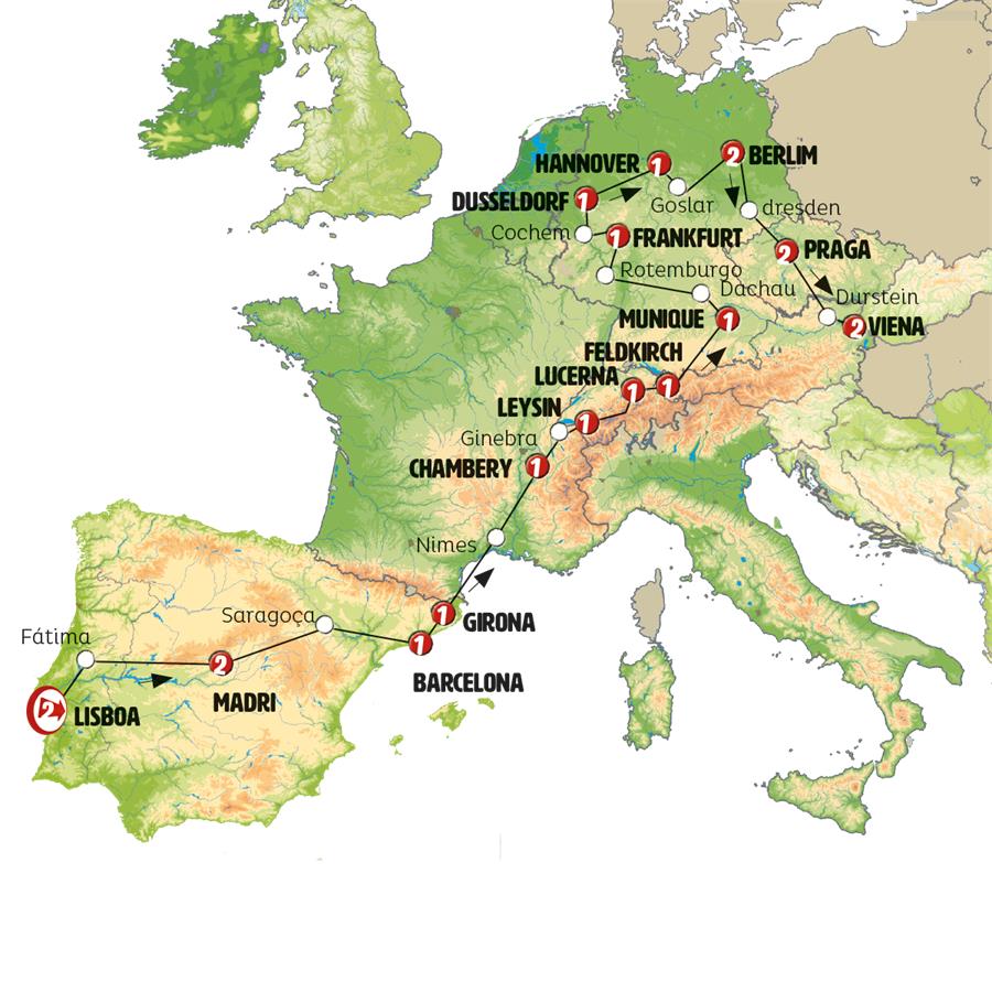 Lisboa, Cáceres, Madrid, Zaragoza, Poblet, Barcelona, Gerona, carrieres de lumiere, Chambery, Genebra, Gruyeres, Leysin, Interlaken, Lucerna, Einsiedeln, Vaduz, Feldkirch, Lago Constança , Lindau, Munique, Füssen, Rotemburgo, Frankfurt, crucero por el rhin, Colônia, Dortmund, ruta cuentos de hadas, Hannover, Goslar, Berlim, Dresden, Praga, Ceske Budejovice, Cesky Krumlov, Viena.