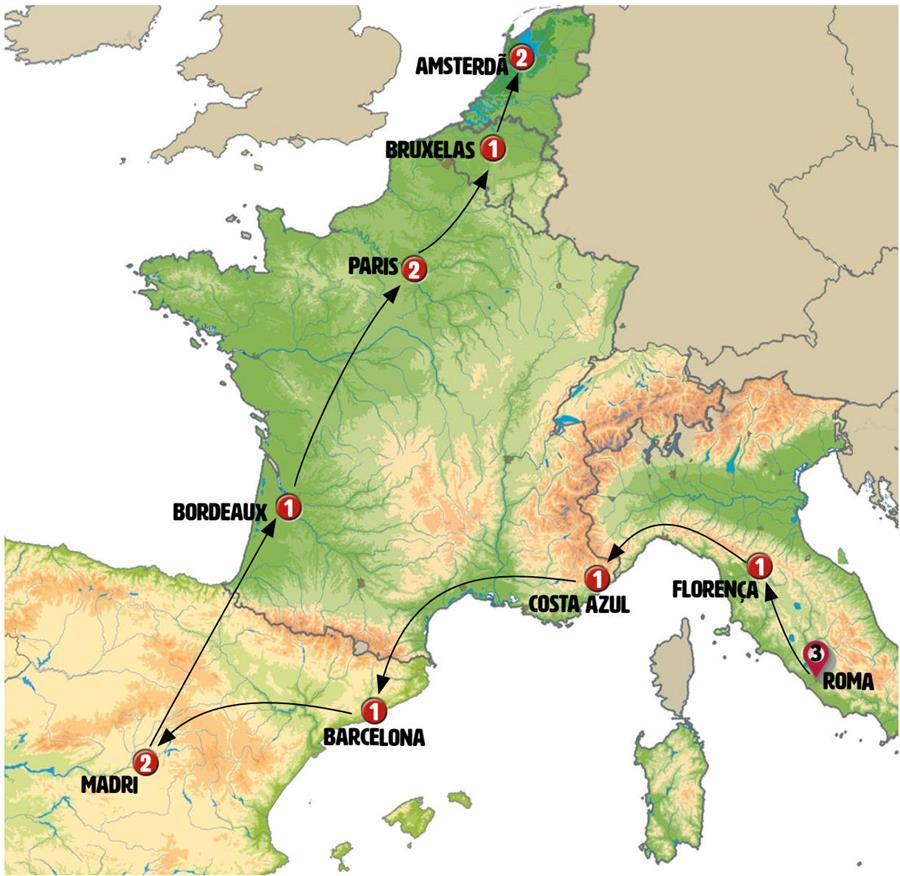 Roma, Florença, Pisa, SESTRI LEVANTE, Montecarlo, Cote D´azur, Arles, Barcelona, Madrid, San Sebastian, Bordeaux, Blois, Paris, Eperlecques, Calais, Bruges, Gante, Haia, Amsterdã.
