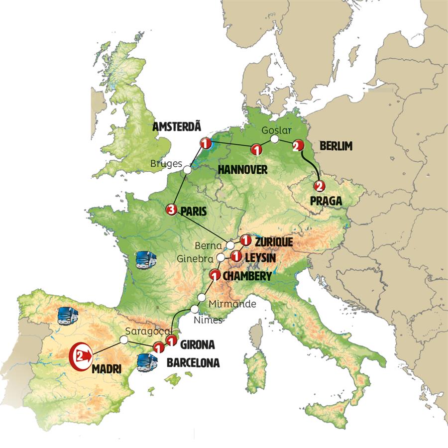 Madrid, Zaragoza, Poblet, Barcelona, Gerona, carrieres de lumiere, Chambery, Genebra, Gruyeres, Leysin, Interlaken, Lucerna, Zurich, Strasbourg, Paris, Bruges, Amsterdã, Hannover, Goslar, Berlim, Dresden, Praga.