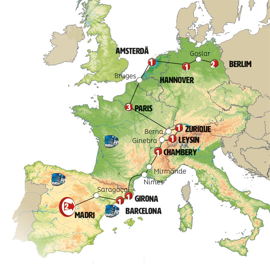 Madrid, Zaragoza, Poblet, Barcelona, Gerona, carrieres de lumiere, Chambery, Genebra, Gruyeres, Leysin, Interlaken, Lucerna, Zurich, Strasbourg, Paris, Bruges, Amsterdã, Hannover, Goslar, Berlim.