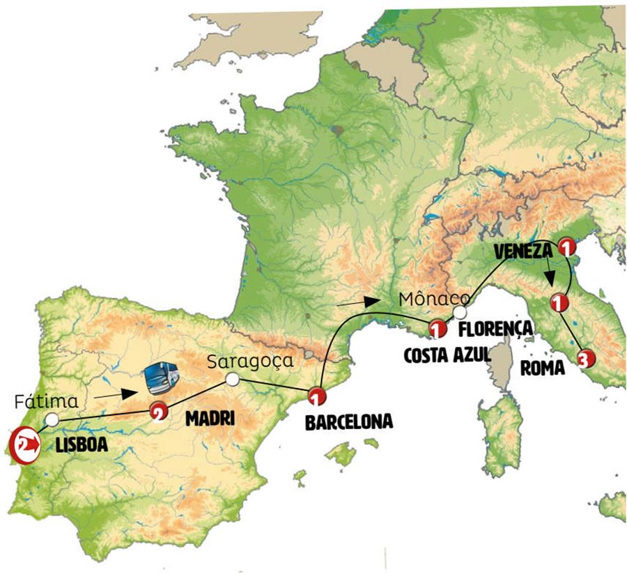 Lisboa, Cáceres, Madrid, Zaragoza, Barcelona, Cote D´azur, Cidade de Mônaco, Gênova, Veneza, Florença, Roma.