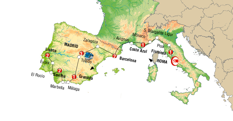 Roma, Florença, Pisa, SESTRI LEVANTE, Montecarlo, Cote D´azur, Arles, Barcelona, comarca del penedes, Zaragoza, Madrid, Granada, Nerja, Málaga, Ronda, Sevilha, Merida, Évora, Lisboa.