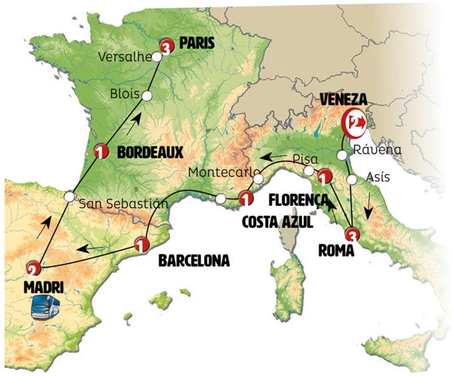Veneza, Ravena, Assis, Roma, Florença, Pisa, SESTRI LEVANTE, Montecarlo, Cote D´azur, Arles, Barcelona, Madrid, San Sebastian, Bordeaux, Blois, Paris.