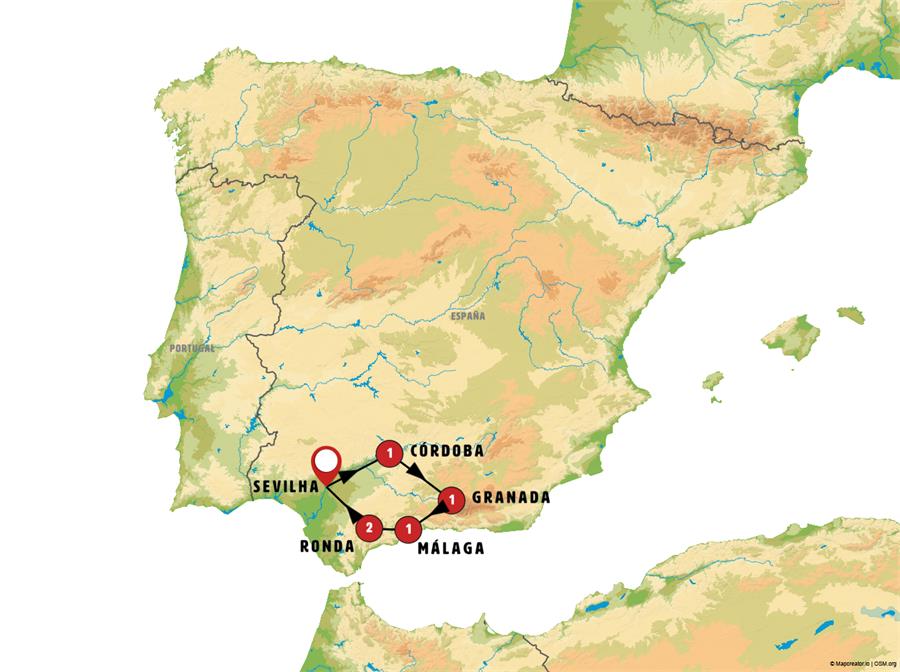 Sevilha, Carmona, Córdoba, baena, Granada, Nerja, Frigiliana, Málaga, Ronda, setenil de las bodegas, Olvera.