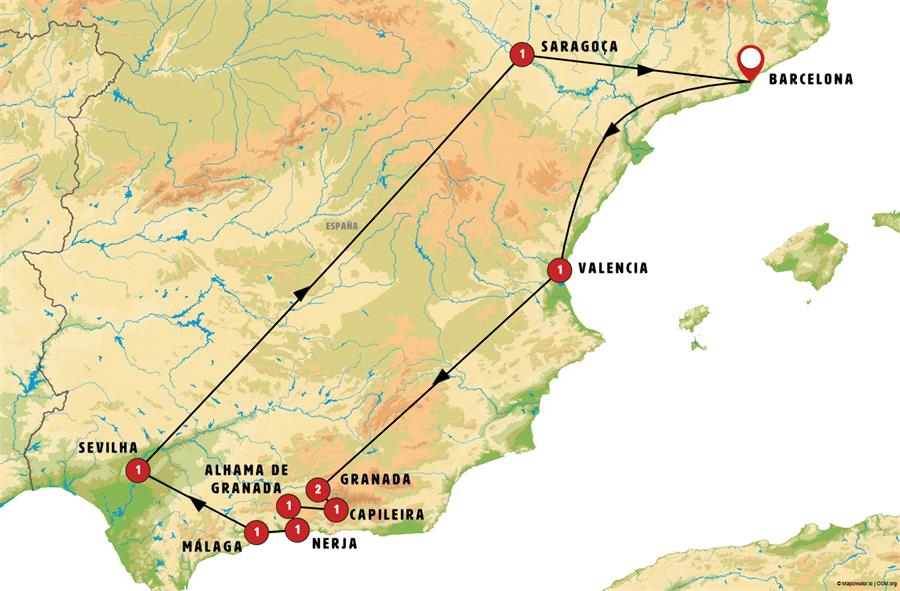 Barcelona, peniscola, Valência, Alicante, Guadix, Granada, pampaneira, trevelez, capileira, Lanjaron, alhama de granada, Nerja, Frigiliana, Málaga, Ronda, Sevilha, Zaragoza, Poblet.