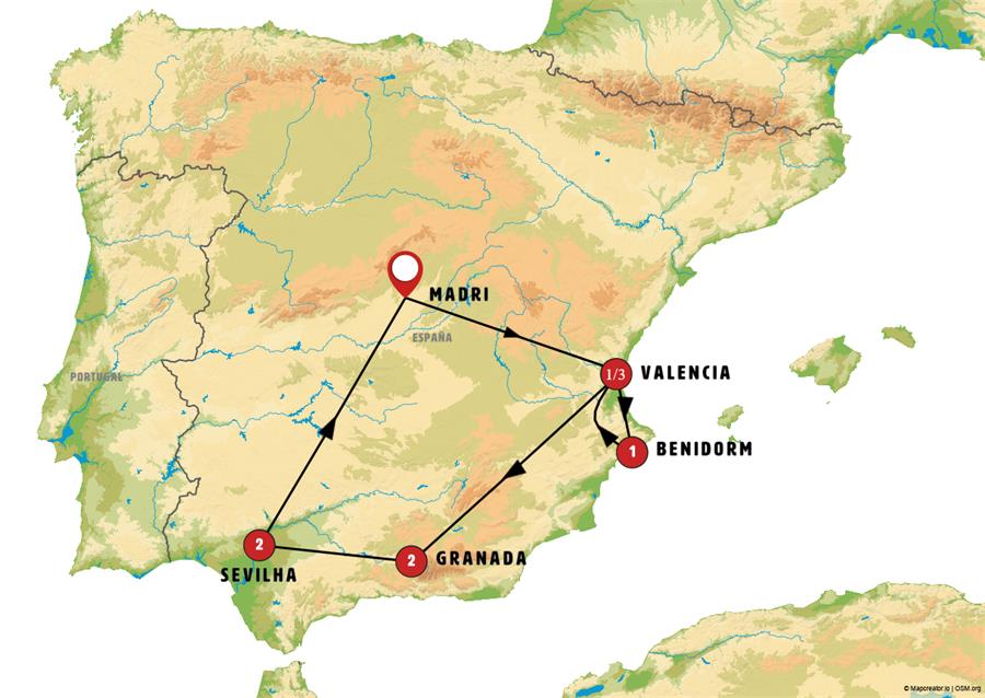 Madrid, Alarcon, Valência, Denia, Benidorm, guadalest, jijona, Alicante, Guadix, Granada, Nerja, Málaga, Ronda, Sevilha, Córdoba, consuegra.