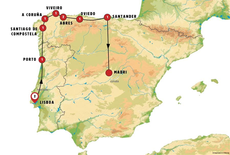 Lisboa, Fátima, Porto, Santuario do Bom Jesus, Cambados, Santiago de Compostela, Lugo, Betanzos, a coruña, puentedeume, cabo ortegal, Viveiro, mondoñedo, Ribadeo, abres, Cudilhero, Gijon, Oviedo, Covadonga, Santilhana, Santander, Bilbao, Area de Serviço Foronda, Madrid.