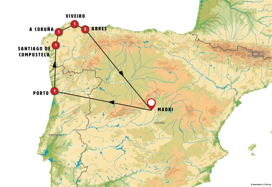 Madrid, Cidade Rodrigo, Porto, Santuario do Bom Jesus, Cambados, Santiago de Compostela, Lugo, Betanzos, a coruña, puentedeume, cabo ortegal, Viveiro, mondoñedo, Ribadeo, abres, Cebreiro, León.