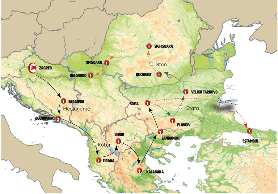 Zagreb, Banja Luka, jajce, Sarajevo, Mostar, Dubrovnik, Kotor, Budva, Tirana, struga, Ohrid, Bitola, Kalambaka, Tesalonica, Melnik, sandansky , Rila, Sofia, Bachkovo, Plovdiv, Kazanlak, shipka, etara, arbanassi, Veliko Tarnovo, basarbovo, Bucareste.