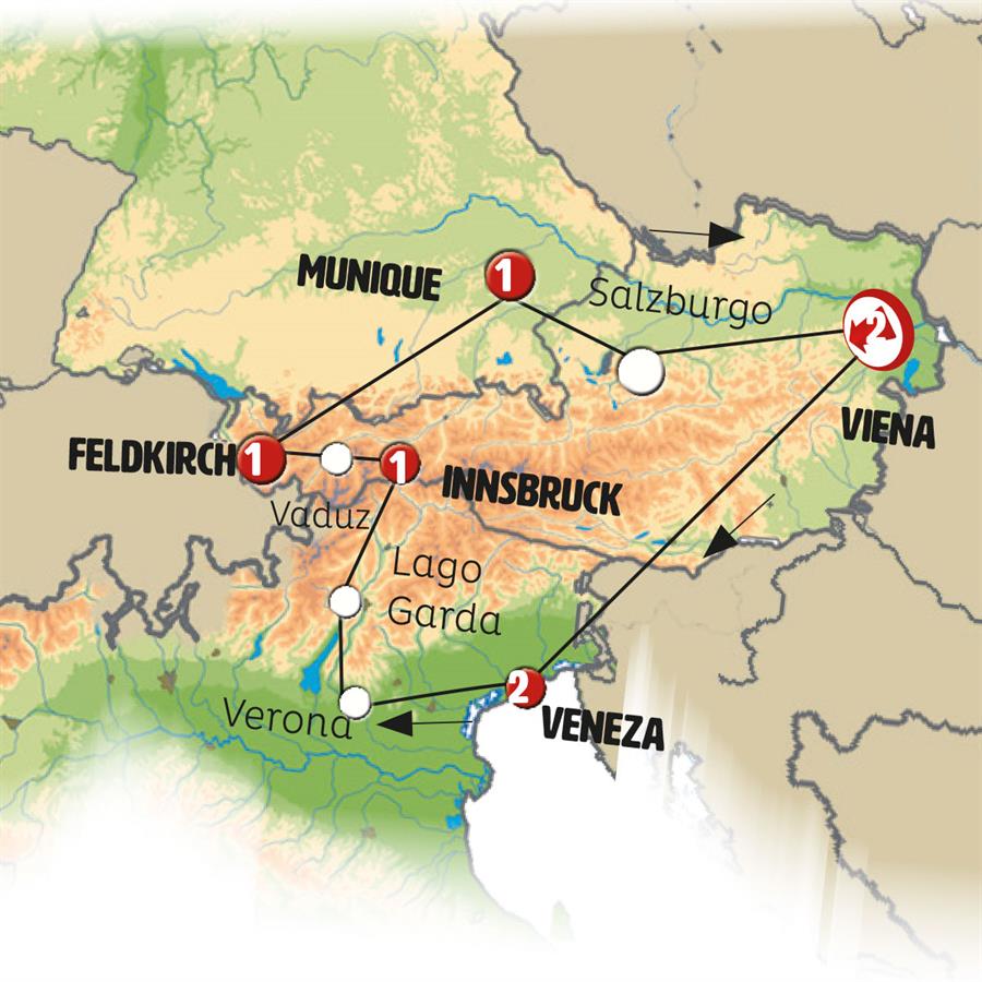 Viena, Maribor, Liubliana, Veneza, Verona, Lago de Garda, Innsbruck, zugspitze, Feldkirch, Lago Constança , Lindau, Munique, Salzburgo, St. Wolfgang, Lago Traunsee.