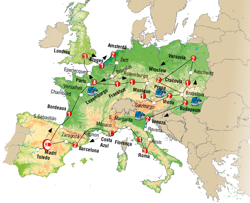 Madrid, San Sebastian, Bordeaux, Chambord, Paris, Canterbury, Londres, canal de la mancha, Bruges, Gante, Middelburg, Roterdã, Amsterdã, kinderdijk, Bruxelas, Bouillon, Luxemburgo, Cochem, crucero por el rhin, Frankfurt, Rotemburgo, Munique, Salzburgo, St. Wolfgang, Lago Traunsee, Viena, Bratislava, Trencin, Cracóvia, Auschwitz, Czestochowa, Varsóvia, Wroclaw, Praga, Lednice, Budapeste, region de carintia , Veneza, Ravena, Assis, Roma, Florença, Pisa, SESTRI LEVANTE, Montecarlo, Cote D´azur, Arles, Barcelona, comarca del penedes, Zaragoza.