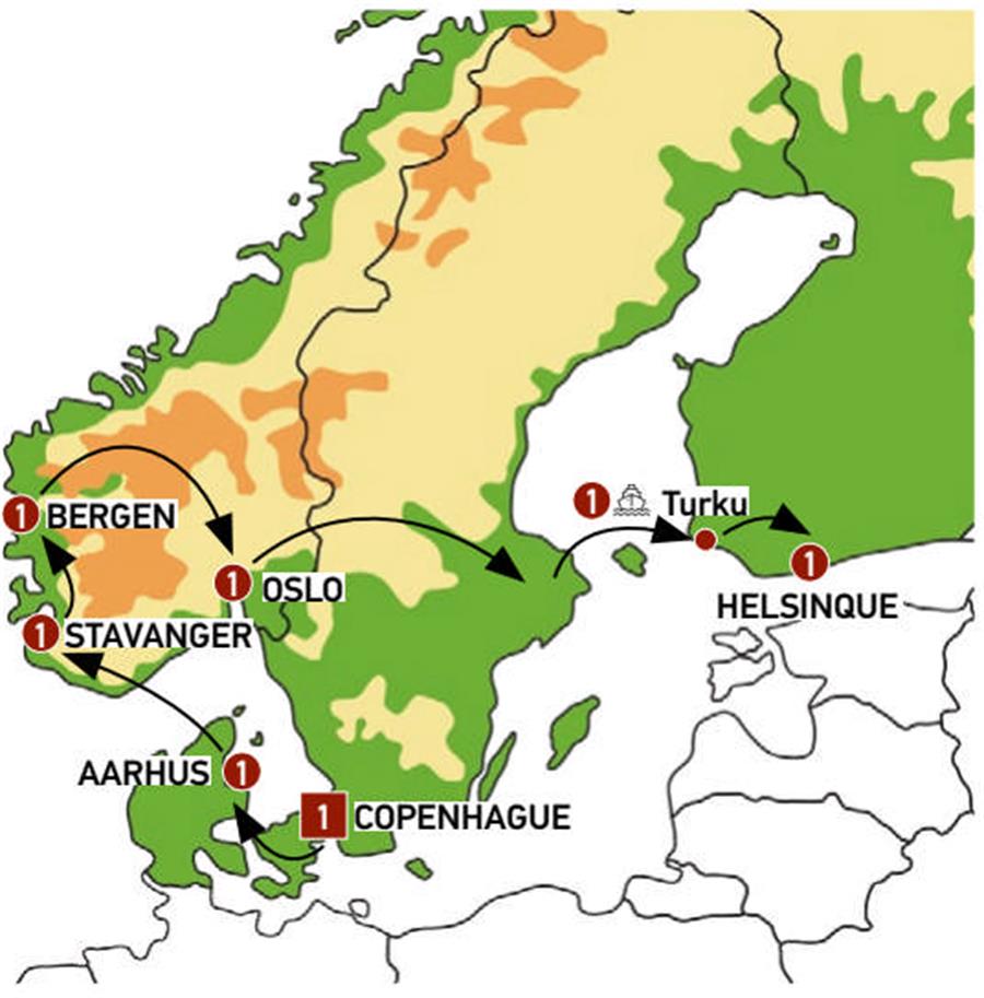 Copenhague, Odense, Arhus, ferri kristiansand, Kristiansand, Stavanger, Bergen, fiordo sogne, Oslo, Orebro, Estocolmo, ferri estocolmo turku, Naantali, Helsinki.