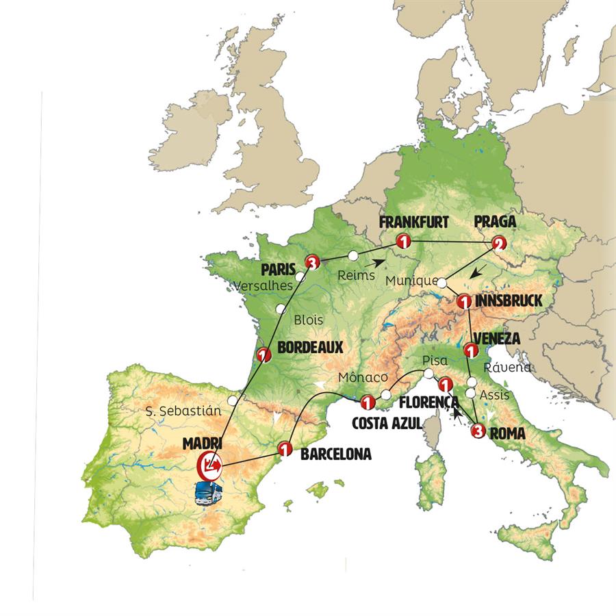 Madrid, San Sebastian, Bordeaux, Blois, Paris, Reims, Luxemburgo, Frankfurt, Rotemburgo, Nuremberg, Praga, Munique, Innsbruck, Veneza, Ravena, Assis, Roma, Florença, Pisa, SESTRI LEVANTE, Montecarlo, Cote D´azur, Arles, Barcelona.
