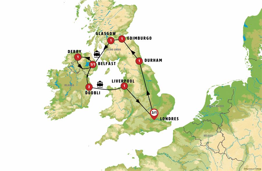 Londres, Cambridge, York, Durham, Alnwick, Edimburgo, Inverness, Lago Ness, Fort Augustus, Glasgow, belfast, cushendun, ballycastle, calzada del gigante, derry, Donegal, marble arch, Dublin, Caernarfon, Liverpool, stratford, Oxford.