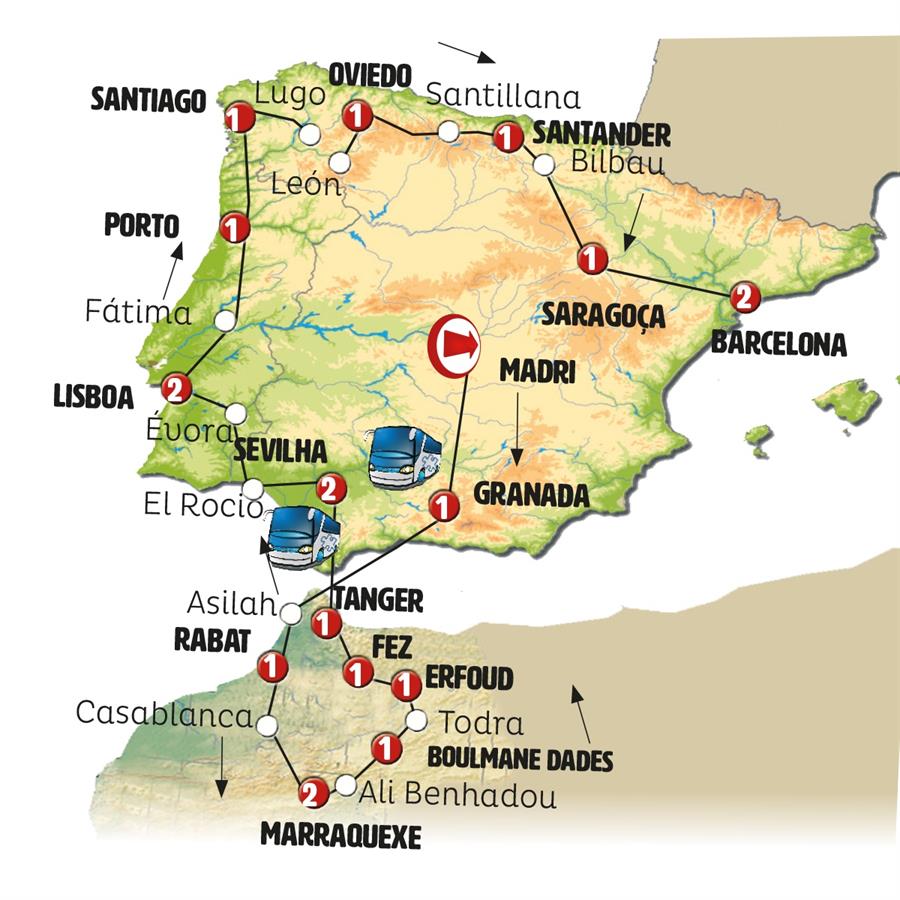 Madrid, Granada, Tânger, assilah, Rabat, Casablanca, Marrakech, ait ben hadu, Ouarzazate, Boumalne Dadès, Todra, Erfoud, Fes, Sevilha, Merida, Évora, Lisboa, Fátima, Porto, Santuario do Bom Jesus, Cambados, Santiago de Compostela, Lugo, Cebreiro, León, Oviedo, Covadonga, Santilhana, Santander, Bilbao, Area de Serviço Foronda, La Rioja, Zaragoza, Poblet, Barcelona.