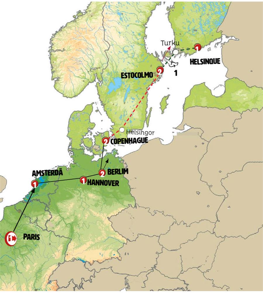 Paris, Bruges, Amsterdã, Hannover, Goslar, Berlim, Copenhague, jonkoping, vadstena, Estocolmo, ferri estocolmo turku, Naantali, Helsinki.