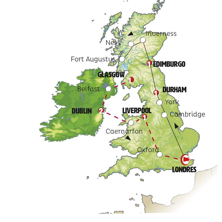 Londres, Cambridge, York, Durham, Alnwick, Edimburgo, Inverness, Lago Ness, Fort Augustus, Glasgow, lichfield.