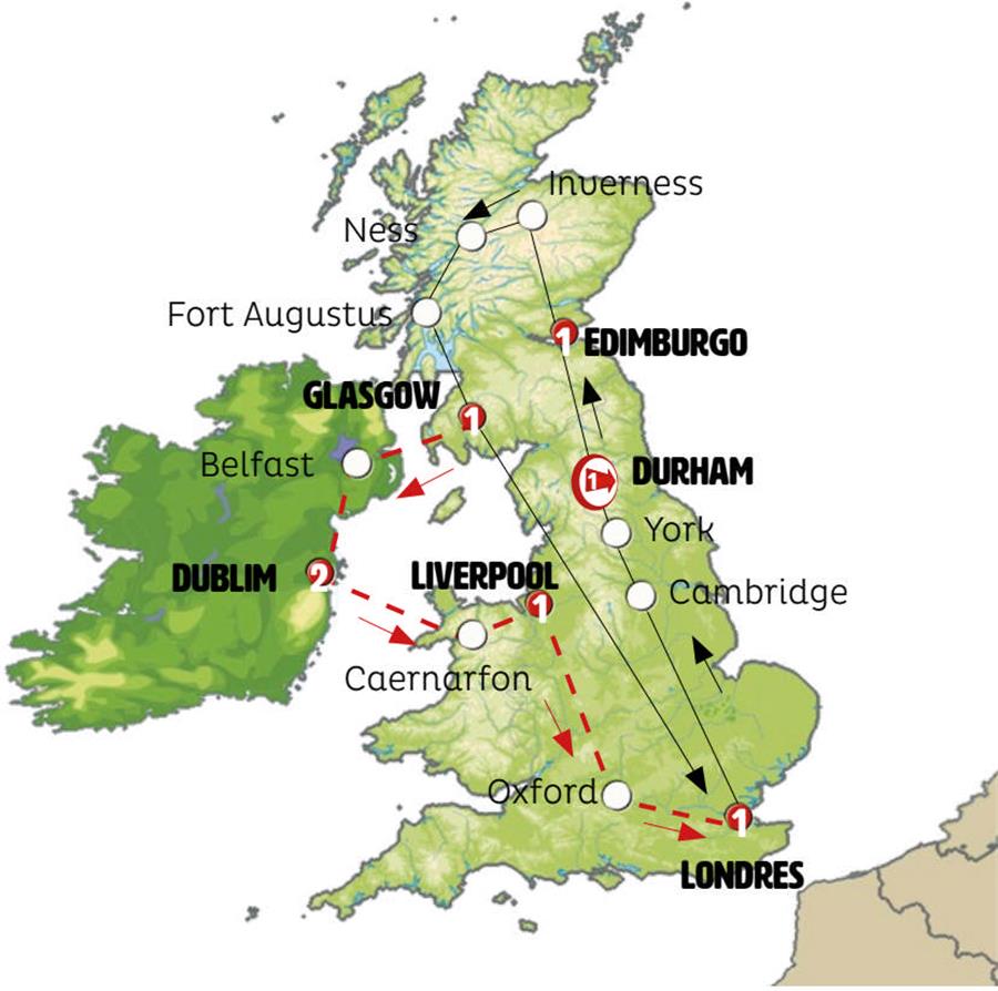 Londres, Cambridge, York, Durham, Alnwick, Edimburgo, Inverness, Lago Ness, Fort Augustus, Glasgow, belfast, Dublin, Caernarfon, Liverpool, stratford, Oxford.