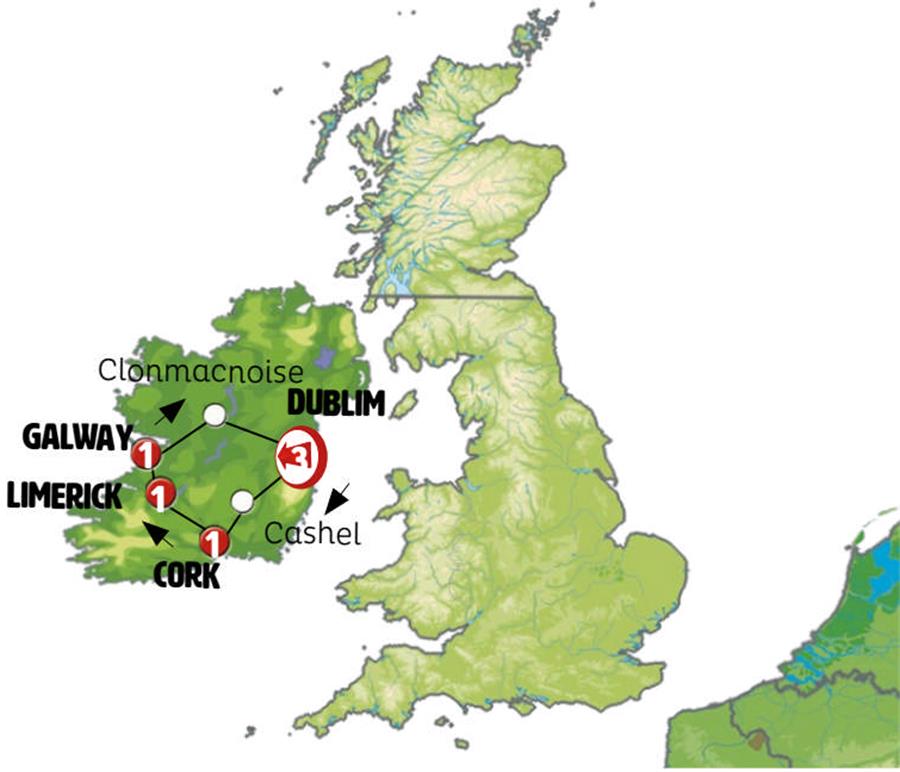 Dublin, Powerscourt, Kilkenny, Cashel, Cork, Kinsale, Killarney, Limerick, Acantilados de Moher, Galway, Clonmacnoise.