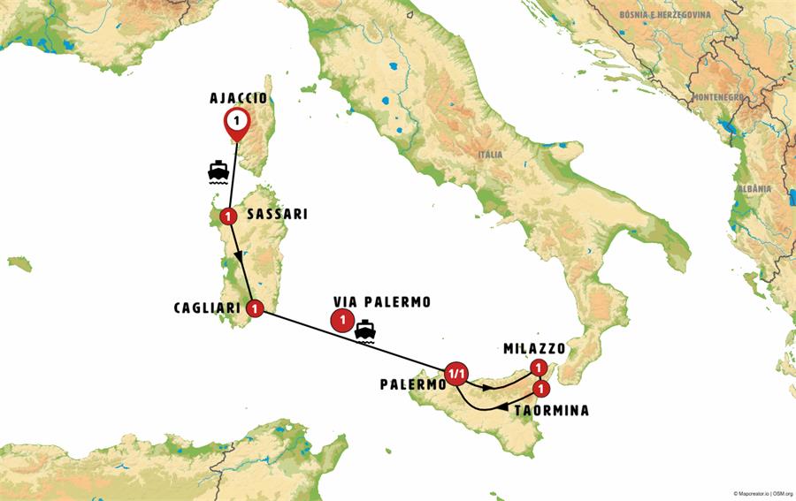 Ajaccio, Bonifacio, Palau, La Maddalena, Sassari, ALGHERO, Bosa, Cagliari, ferri cagliari palermo, Palermo, Cefalu, Castelbuono, tindaris, Milazzo, Vulcano, Lipari, Taormina, Giardini Naxos , villa romana del casale.