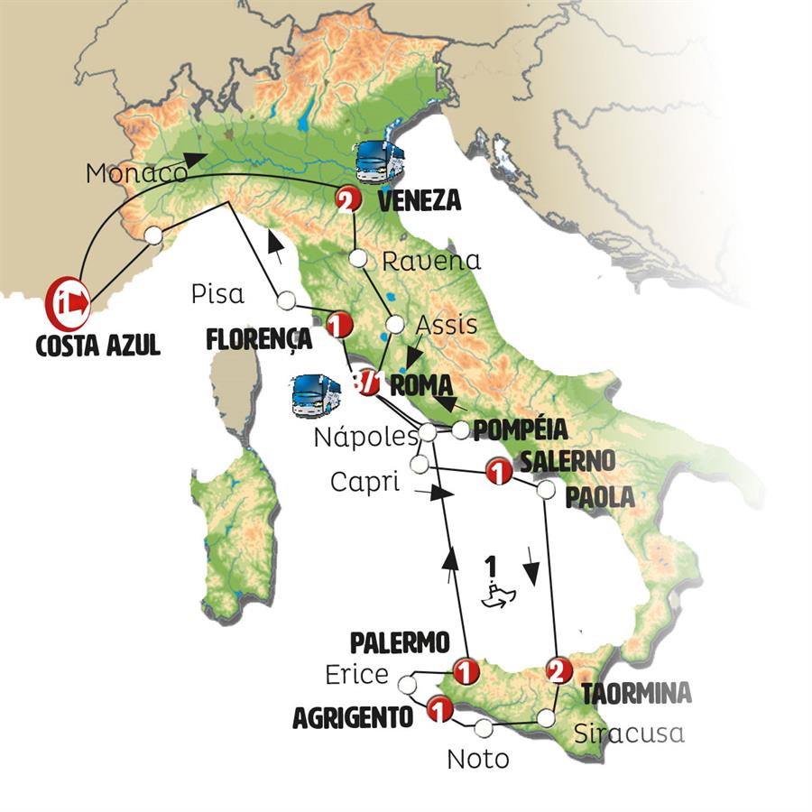 Cote D´azur, Cidade de Mônaco, Gênova, Veneza, Ravena, Assis, Roma, Nápoles, Capri, Sorrento, Salerno, Paola, mesina , Taormina, Catania, Siracusa, Agrigento, Marsala, Érice, Palermo, Monreale, ferri palermo napoles, Pompeia, Florença, Pisa, SESTRI LEVANTE, Montecarlo.