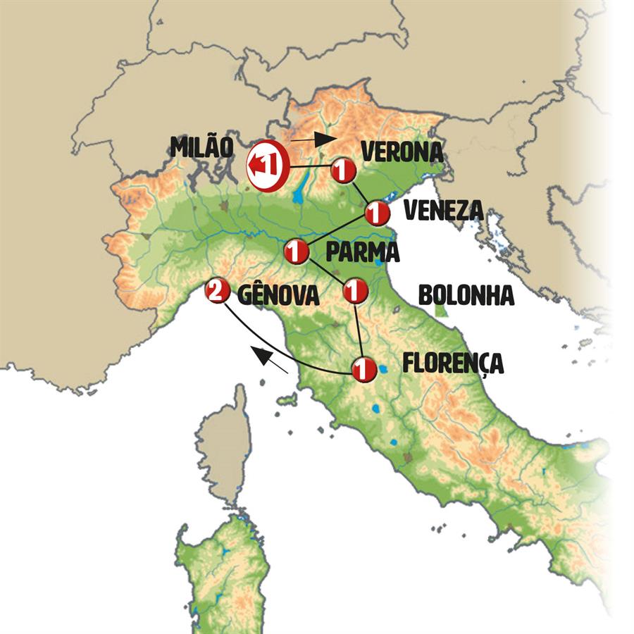 Milão, Região dos Lagos, Verona, Veneza, Ferrara, Modena, Bolonha, Florença, Pisa, Cinque Terre, Gênova, Portofino.