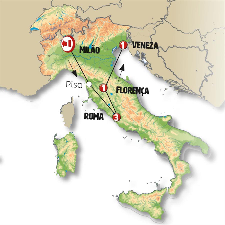 Sairemos de MILÃO para a região da Ligúria, com paisagens magníficas. Paramos em GÊNOVA, uma cidade histórica cuja origem remonta à época romana e mais tarde, durante o período medieval, foi um poderoso estado marítimo. Teremos tempo para passear pelo seu belo centro histórico, onde se destacam a catedral românica e a Piazza Ferrari. Seguindo belas paisagens costeiras continuamos em direção ao PISA, tempo para admirar seu conjunto artístico onde a famosa Torre Inclinada está localizada. FLORENÇA, chegada no final da tarde. Tempo livre.