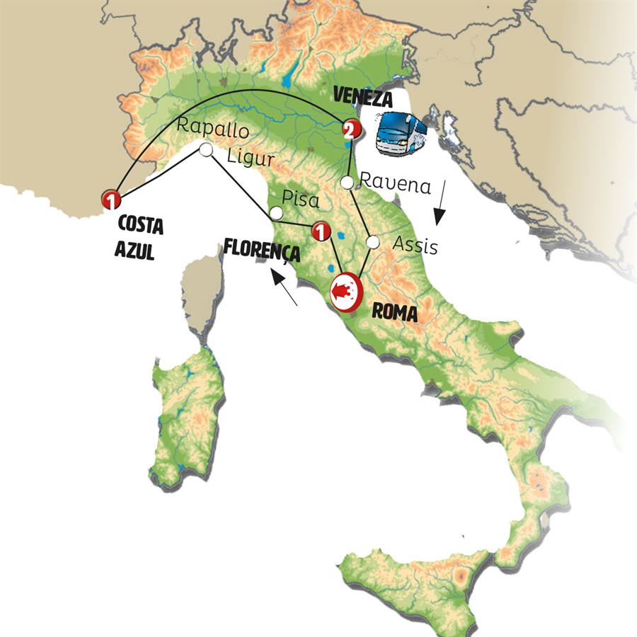 Roma, Florença, Pisa, SESTRI LEVANTE, Montecarlo, Cote D´azur, Cidade de Mônaco, Gênova, Veneza, Ravena, Assis.