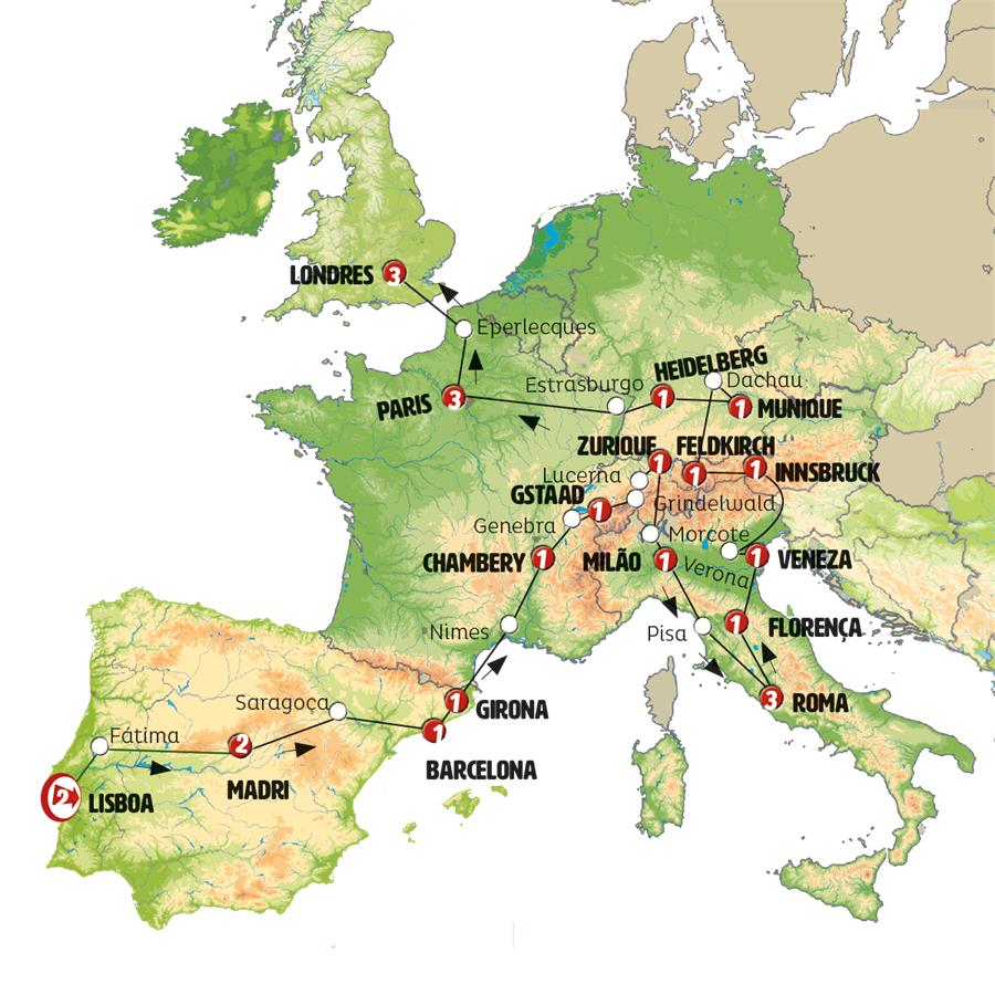 Lisboa, Cáceres, Madrid, Zaragoza, Poblet, Barcelona, Gerona, carrieres de lumiere, Chambery, Genebra, Gruyeres, Leysin, Interlaken, Lucerna, Zurich, Bellinzona, Como, Milão, Gênova, Pisa, Florença, Roma, Bolonha, Ferrara, Veneza, Verona, Lago de Garda, Innsbruck, zugspitze, Feldkirch, Lago Constança , Lindau, Munique, Stuttgart, Heidelberg, Strasbourg, Paris, Canterbury, Londres.
