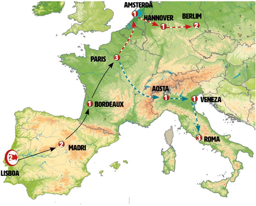 Lisboa, Cáceres, Madrid, San Sebastian, Bordeaux, Blois, Paris.