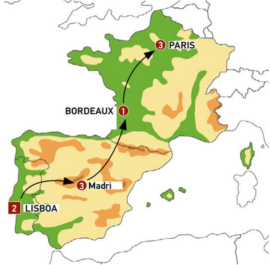 Lisboa, Cáceres, Madrid, San Sebastian, Bordeaux, Blois, Paris.